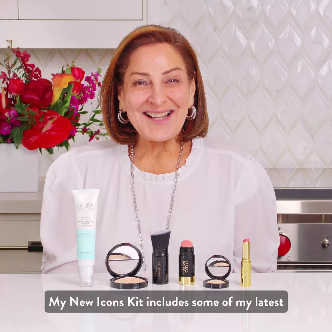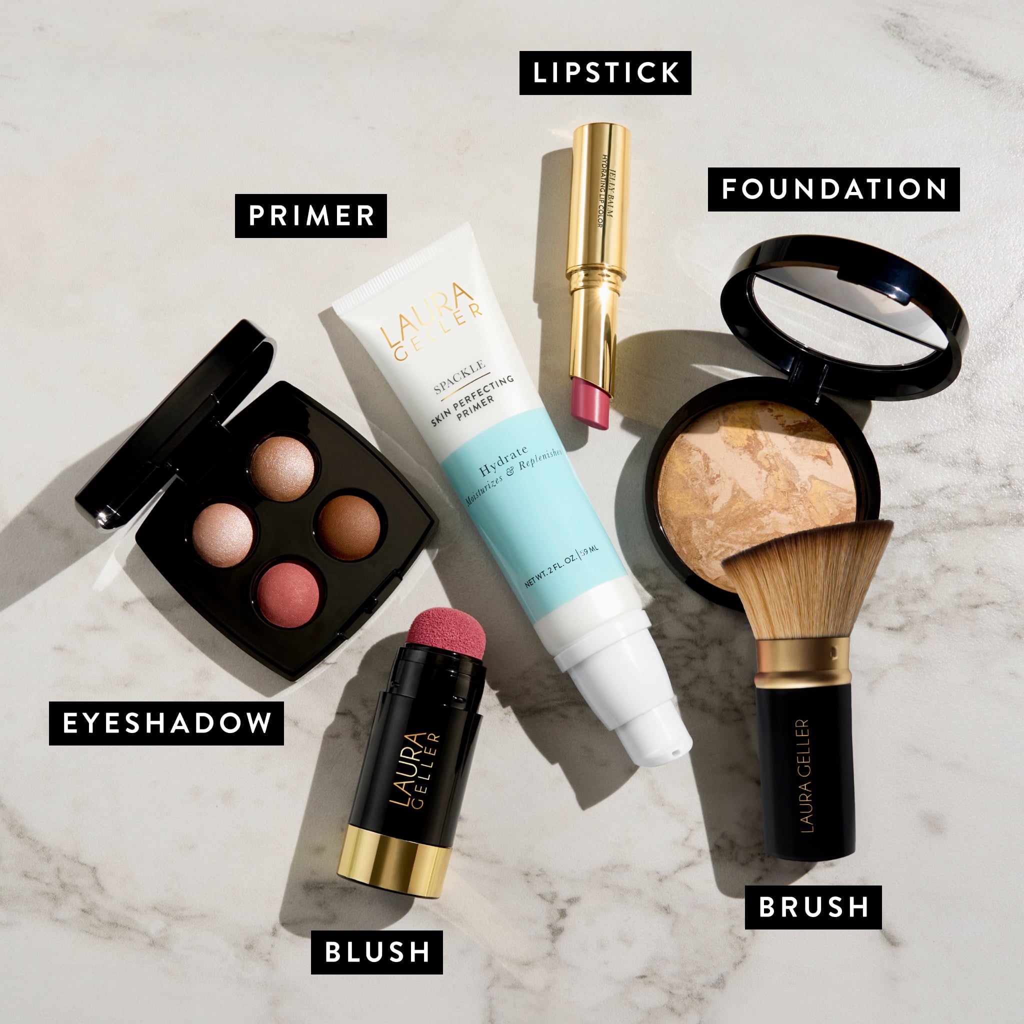 This 6-piece kit includes Baked Balance-n-Brighten Color Correcting Foundation. Spackle Skin Perfecting Primer: Hydrate. Serum Blush Cheek Tint in Practical Pink. Jelly Balm Hydrating Lip Color in the shade In the Buff. Baked Eyeshadow Quad. and our Retractable Angled Kabuki Brush.